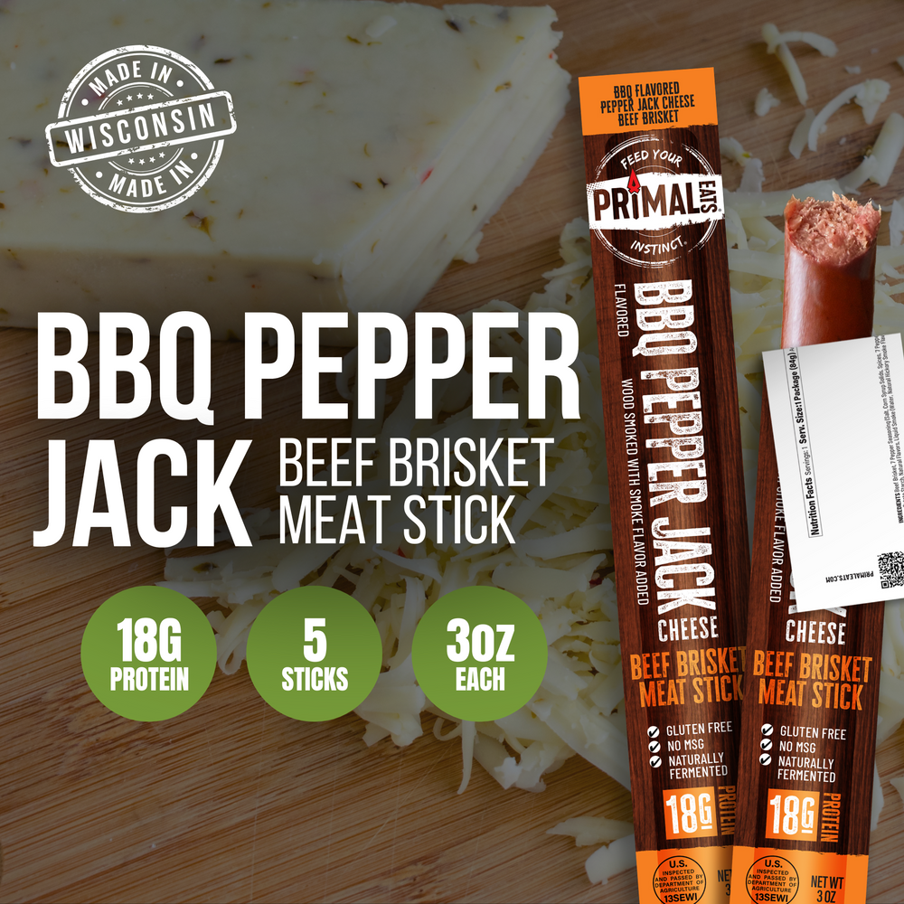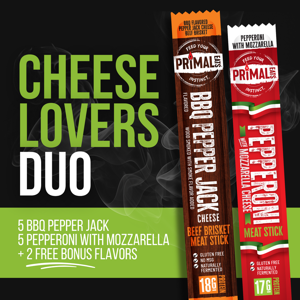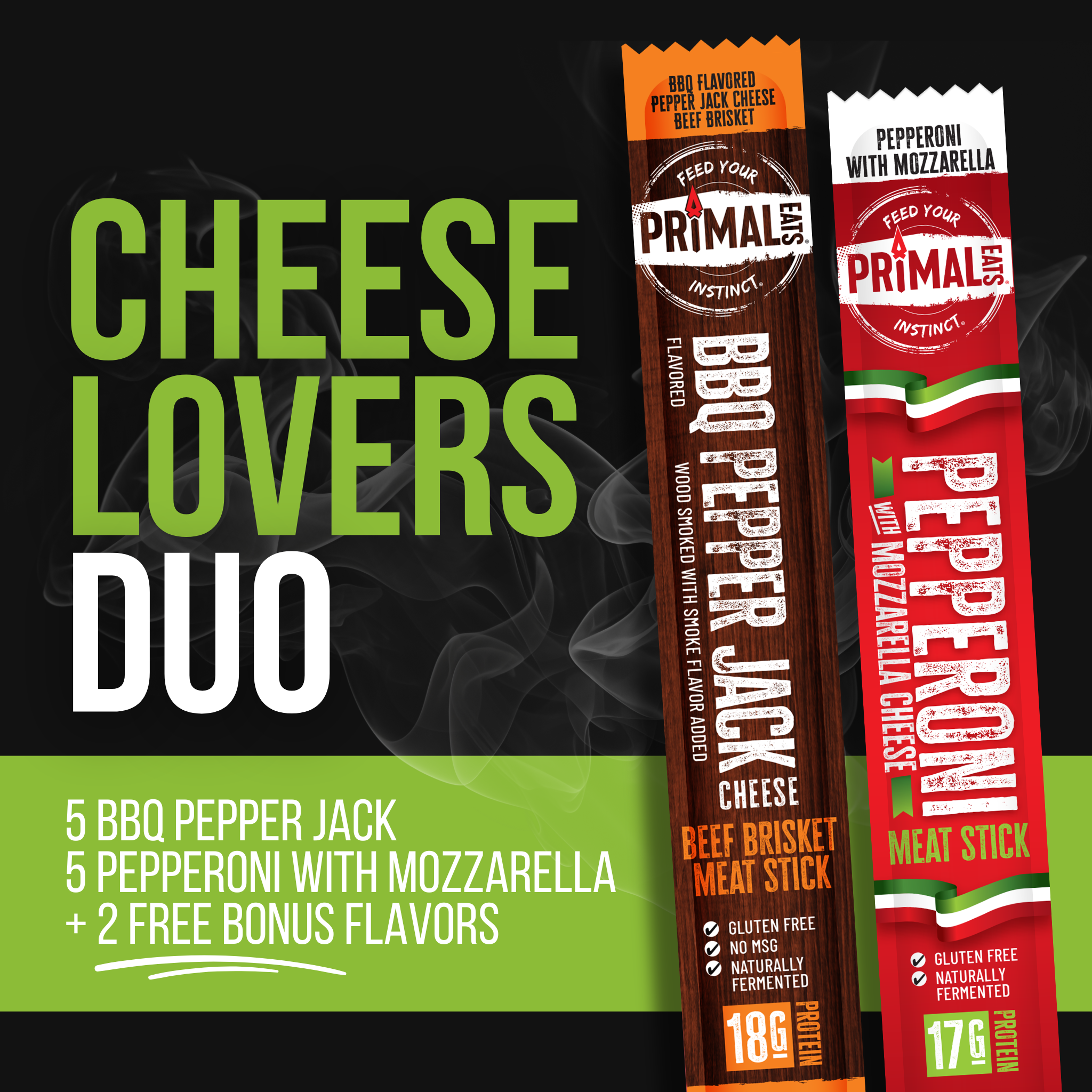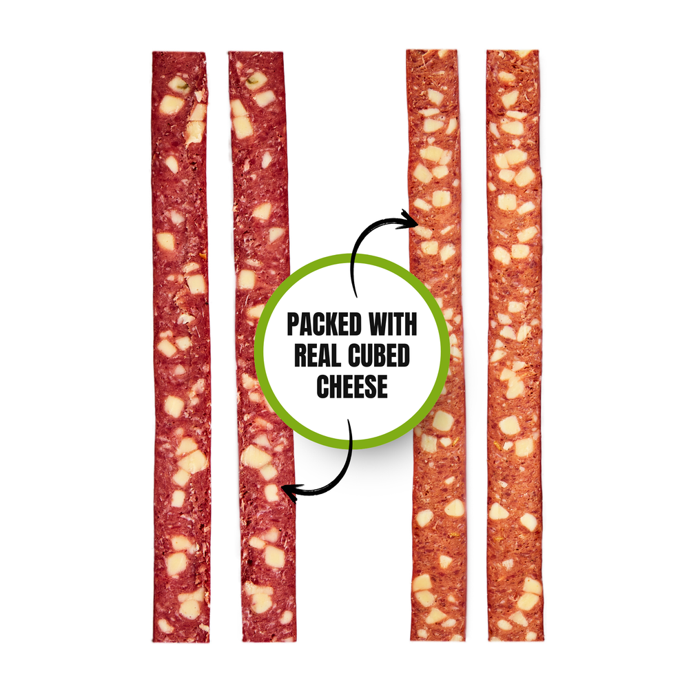 The Cheese Lovers Duo includes 10 of our beef brisket sticks — each one made with cubes of real Wisconsin cheese for a rich, savory twist: