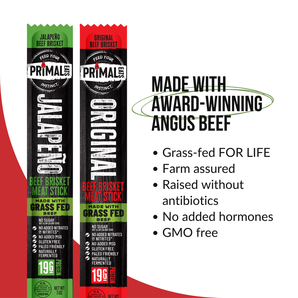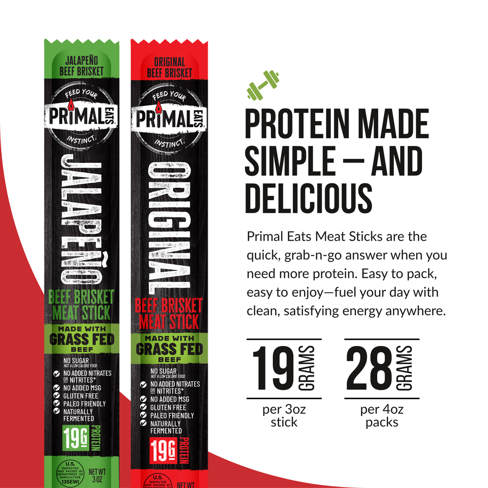 Fuel your day the clean way with the Primal Eats Grass-Fed Brisket Meat Stick Bundle — a protein-packed mix of 10 jumbo 3oz sticks plus two 4oz snack packs. Choose your favorite flavor — Original, Jalapeño, or a half & half mix — and stock up on real, wood-smoked flavor made from 100% grass-fed and finished beef brisket.