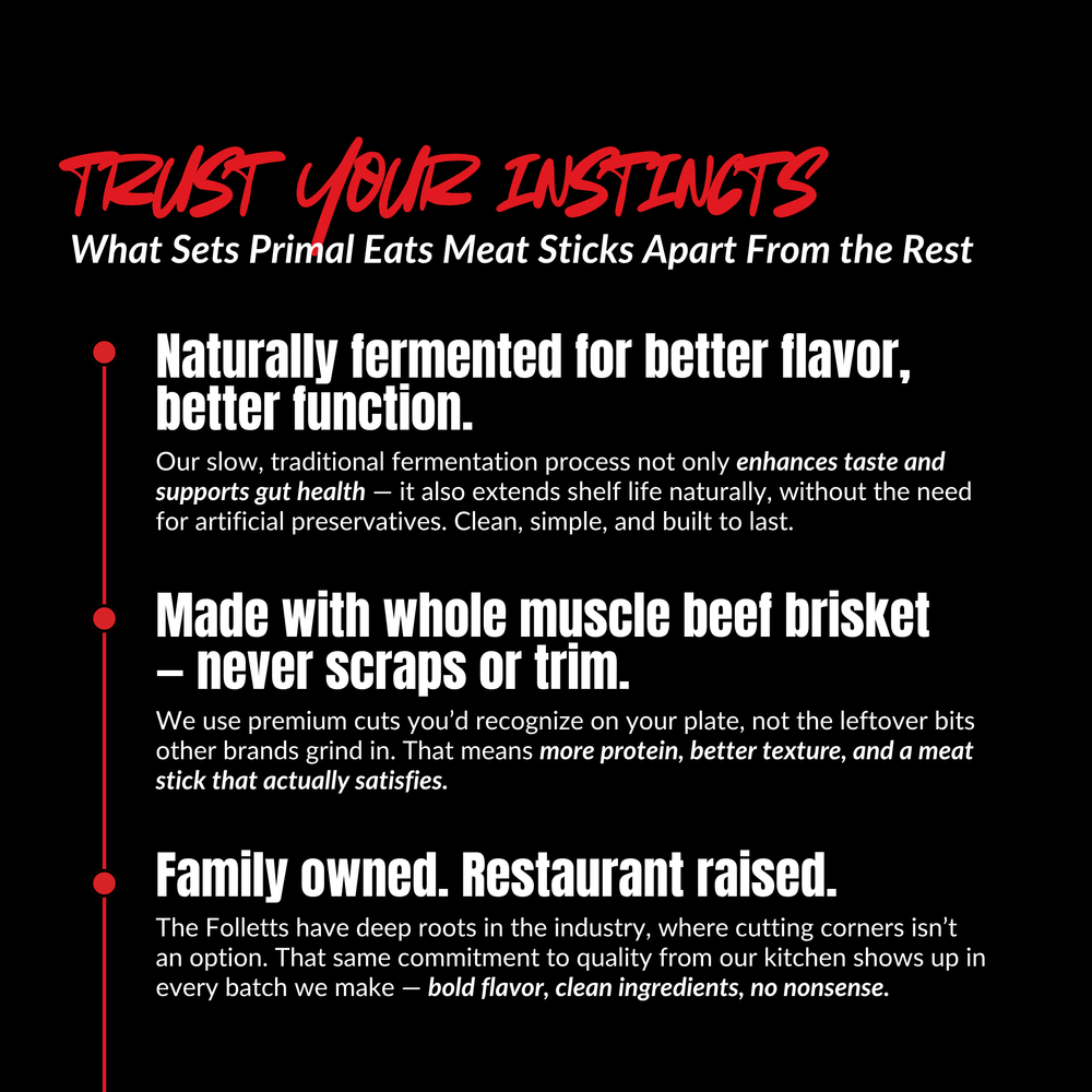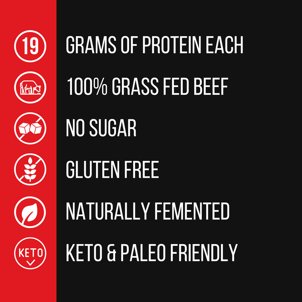 No scraps, no fillers. Just whole muscle grass-fed beef, naturally fermented for real flavor and longer shelf life — without the junk! High in protein, easy to grab, and perfect for wherever life takes you.