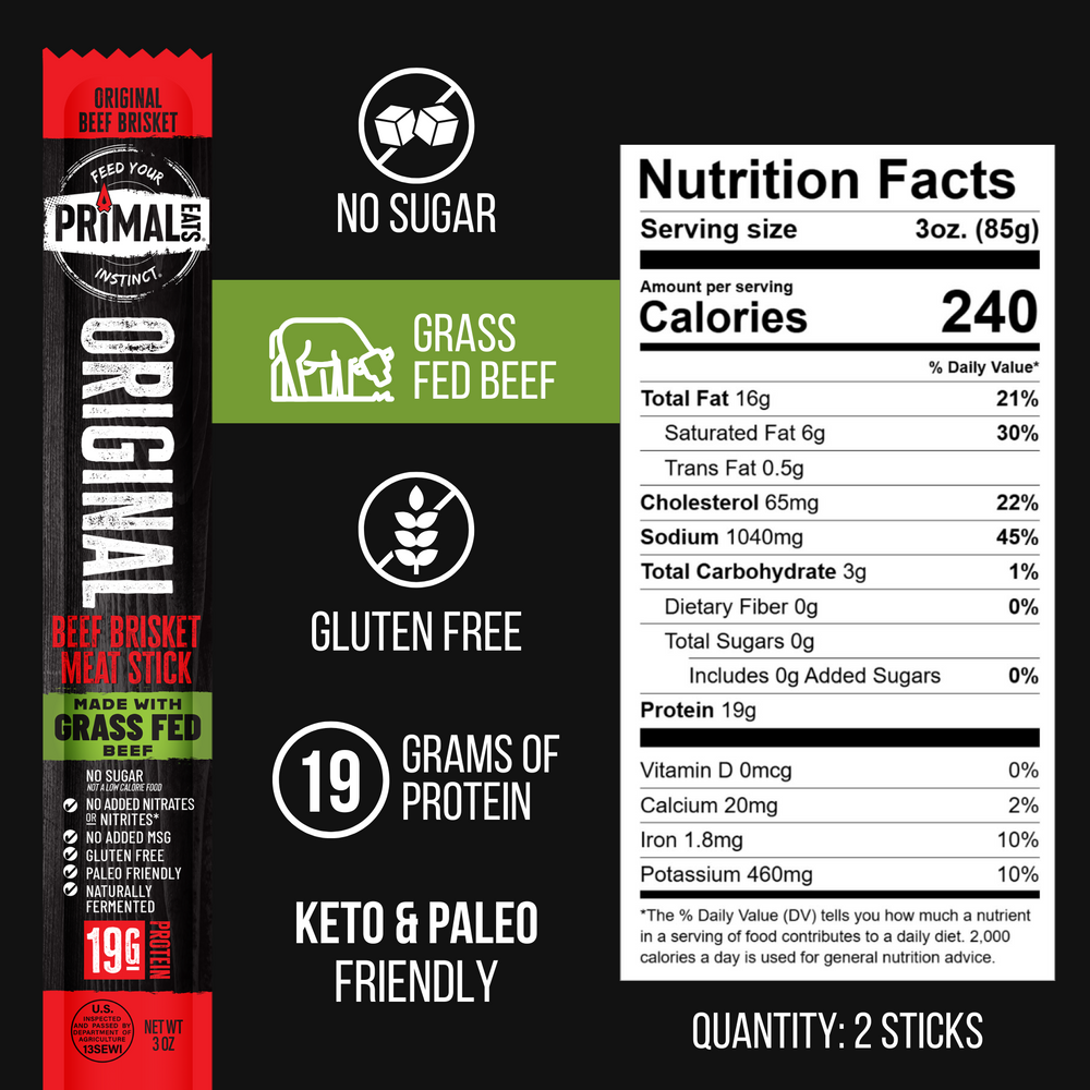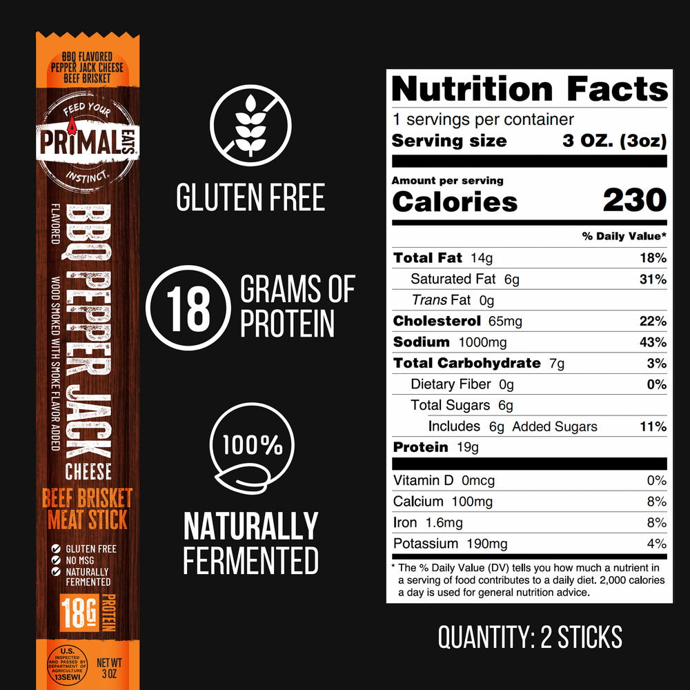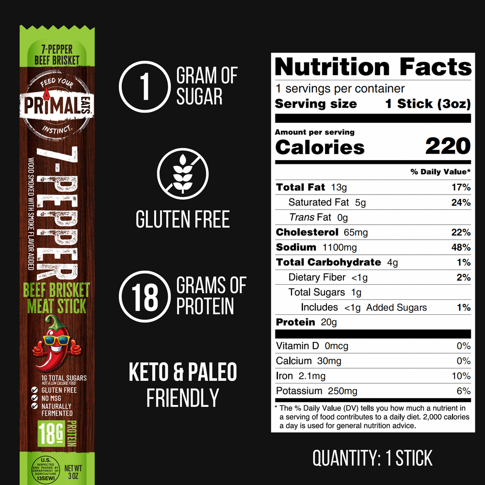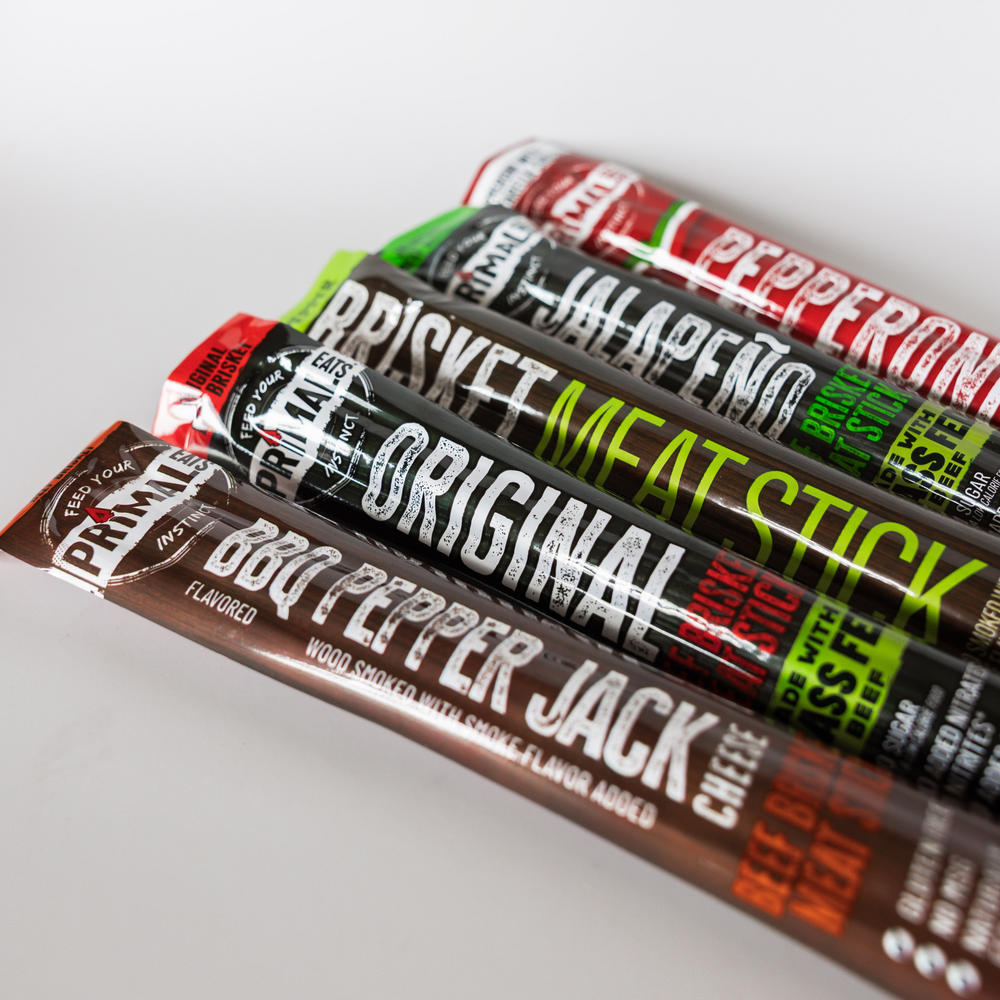 Can’t decide which flavor to get? Try them all with the Primal Eats Brisket Meat Stick Sample Pack! This variety pack includes each of our delicious, high-protein meat stick flavors, so you can experience every bold, smoky, and savory bite.
